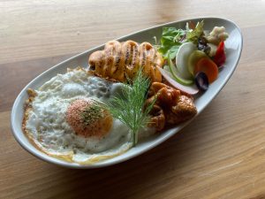 チキントマト煮と目玉焼きをごはんに!サラダを添えました
